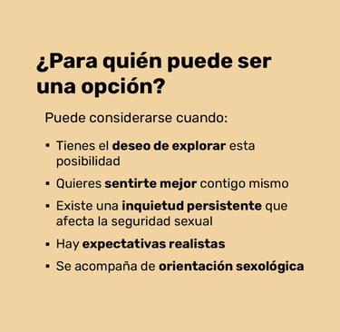 Me dedico a la Sexología y a la Salud Sexual, y con frecuencia acompaño a hombres que me consultan por Disfunción eréctil, Eyaculación precoz, Bajo deseo sexual, Adicción a la pornografía, así como para Check up de salud sexual, Pruebas de VIH e Infecciones de transmisión sexual, siempre desde un enfoque profesional, humano y respetuoso.