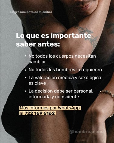 Durante la cita de valoración sí puedo mostrarte fotografías de ejemplos de resultados previos de pacientes que han brindado su consentimiento, para que tengas una referencia. En consulta también revisamos tu caso, y te explico con transparencia qué resultados puedes esperar según tus propias características anatómicas, puesto que cada cuerpo y cada pene es diferente.